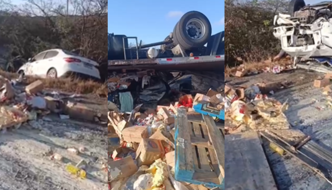 “Houve essa colisão de farol com farol, lado esquerdo, quase frontal, que fez com que o caminhão tombasse, perdesse o controle e aí ele foi pegando os outros veículos quando tombou na pista. Foi quando outro veículo bateu frontalmente com ele, já deitando na pista e os outros quatro veículos também”, detalhou o inspetor da Polícia Federal, Francimuller.